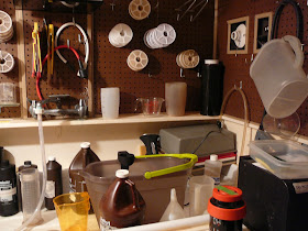 The walls on one side are paneling, and as you can see, cassette wrappers are stuck to it. The other sides are masonite peg board, which had been painted black by Bill. My new space will have no black walls. This is a comfortable one-person darkroom. Put two people in there, and it's awfully close. I want to be able to do film photography workshops in the future, so more space would be desirable.